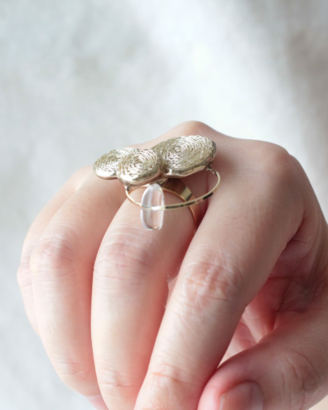 キラリと輝くラメ糸で刺繍された3つの丸が、指先をやさしく華やかに見せてくれるリング。