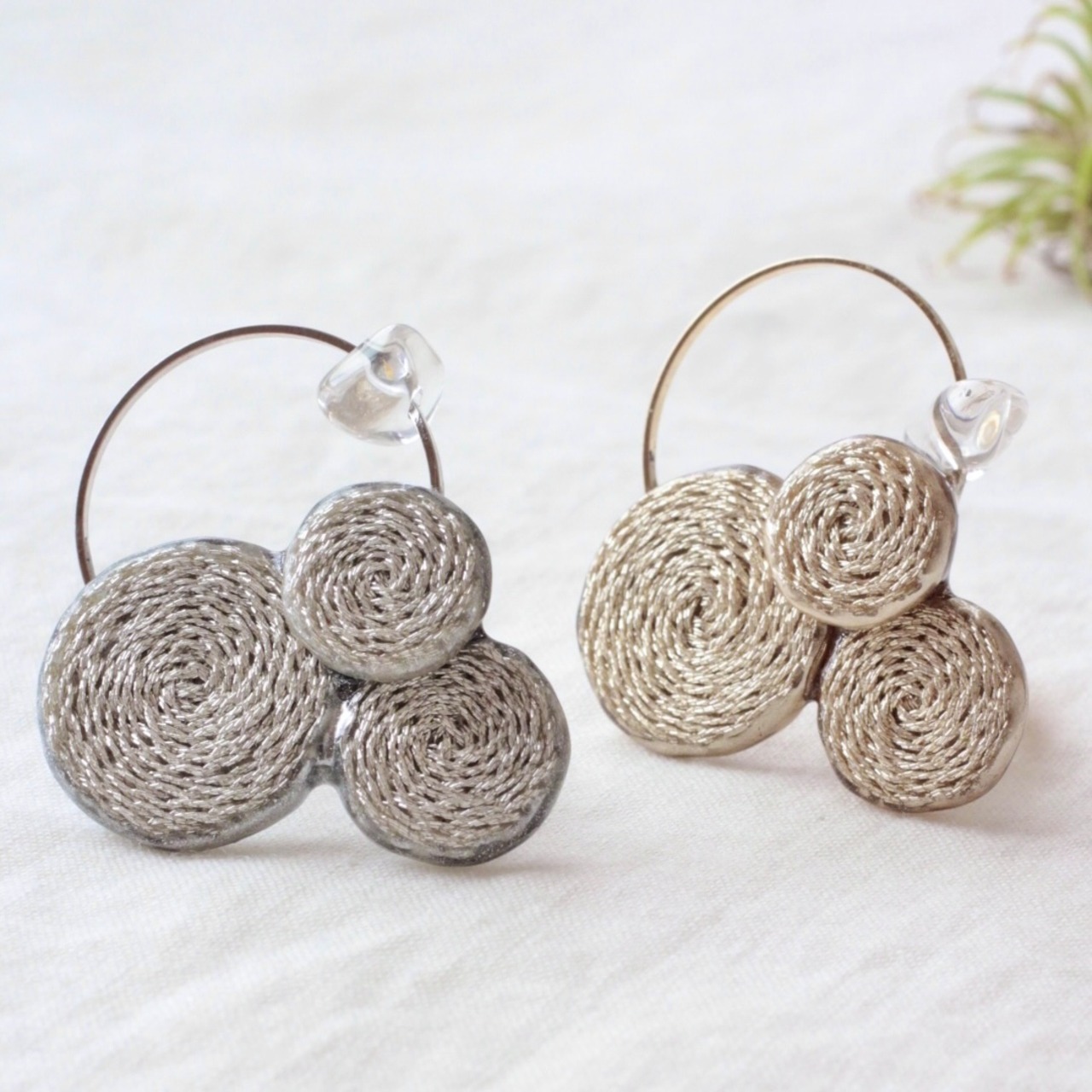 ・刺繍糸、水晶、リング金具(真鍮)、フープ(真鍮)