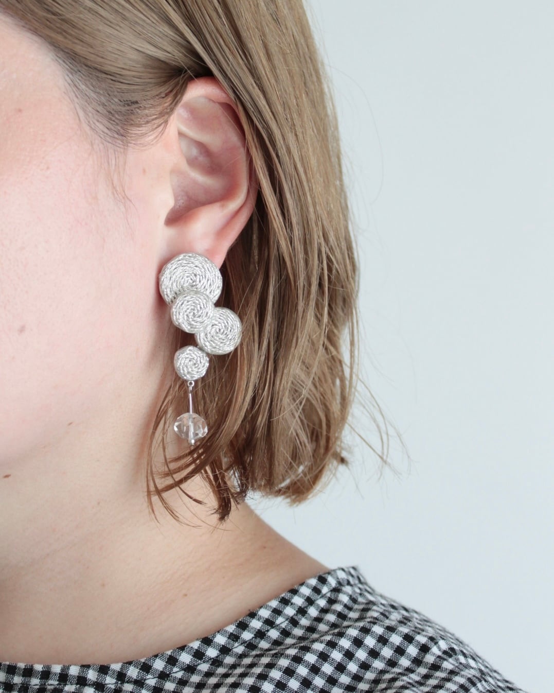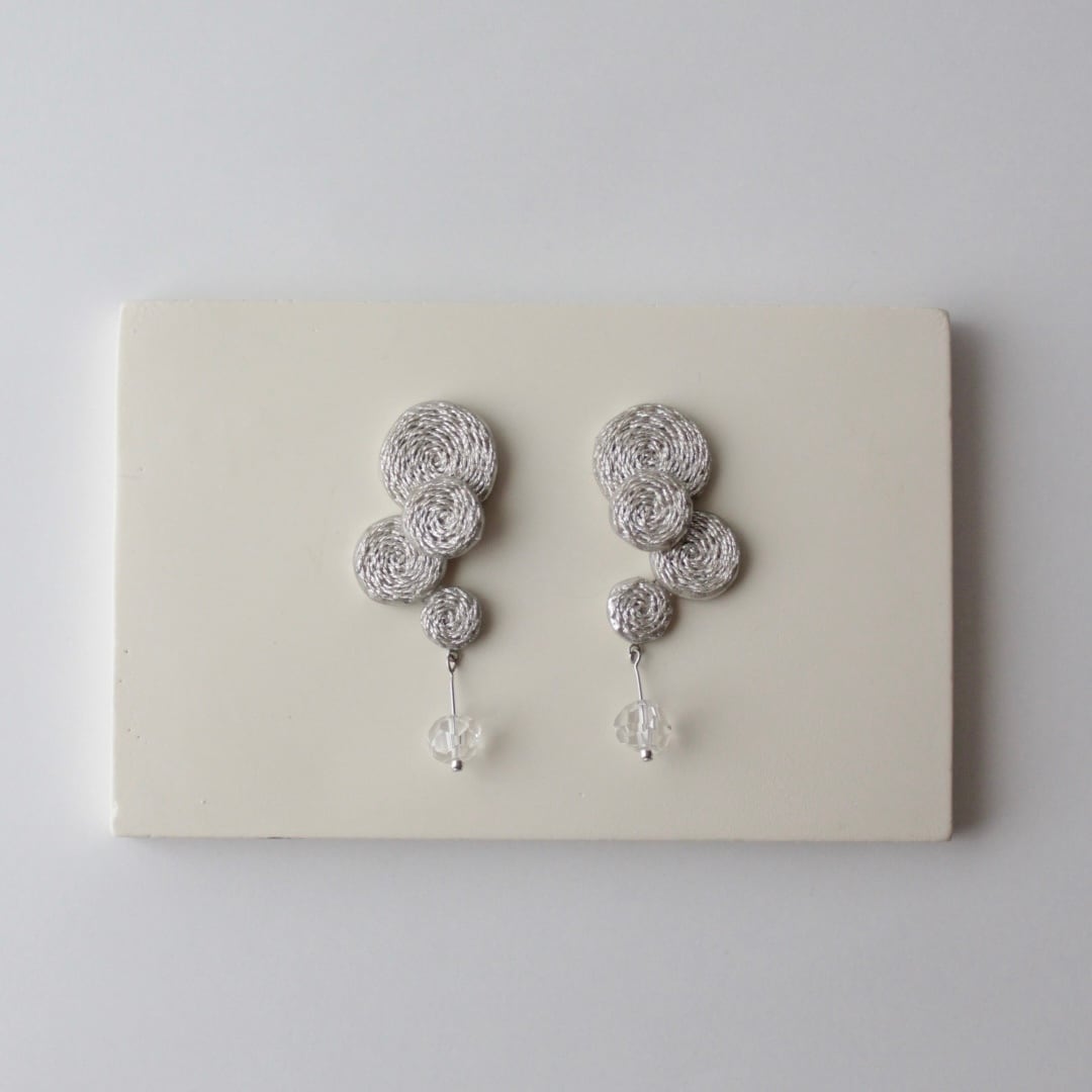ラメ糸で刺繍した丸いモチーフに、水晶がそっと揺れるピアス。