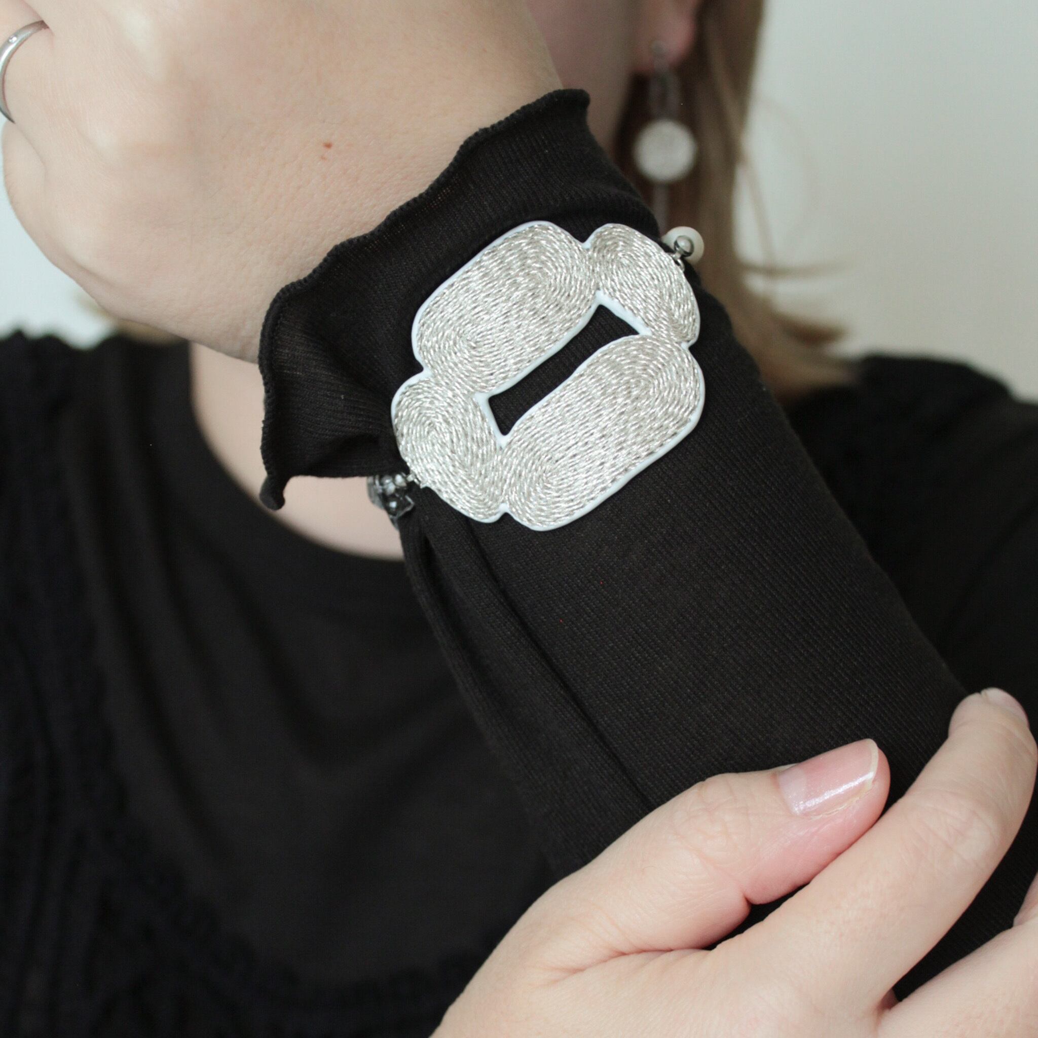 糸の流れで描かれた柔らかなフォルムが、手もとに優しい光を添えます。