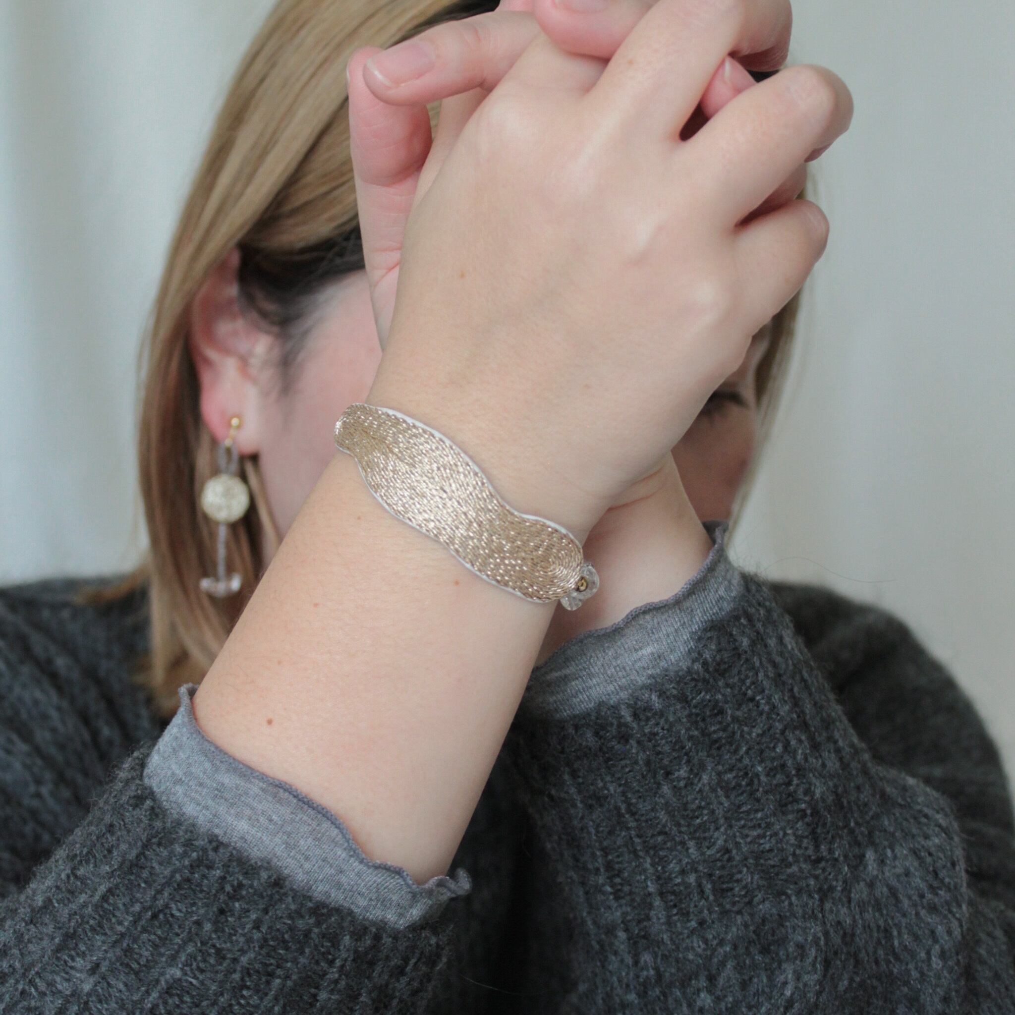 淡水パールと水晶で繋ぎ、手もとに透明感のある輝きを添えました。