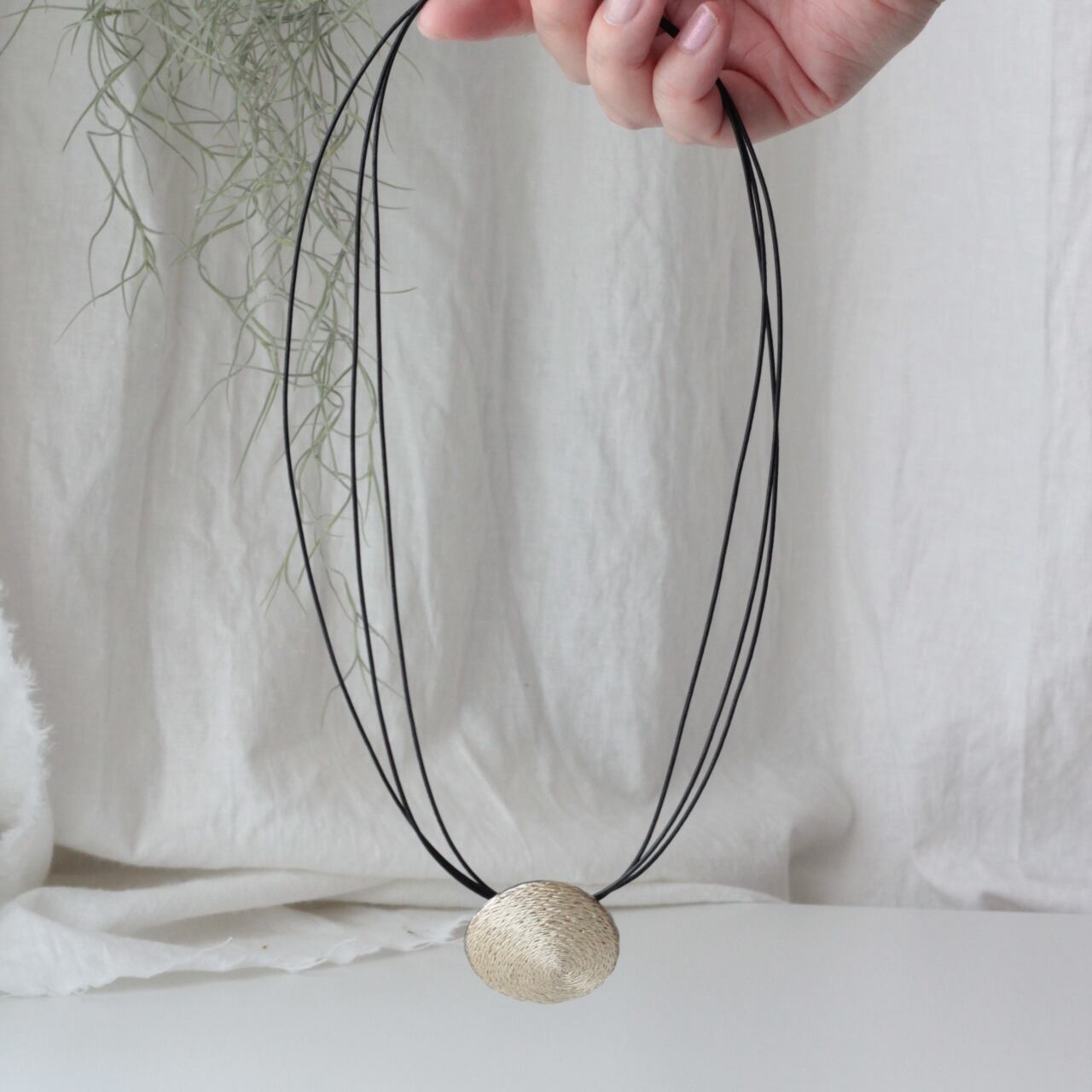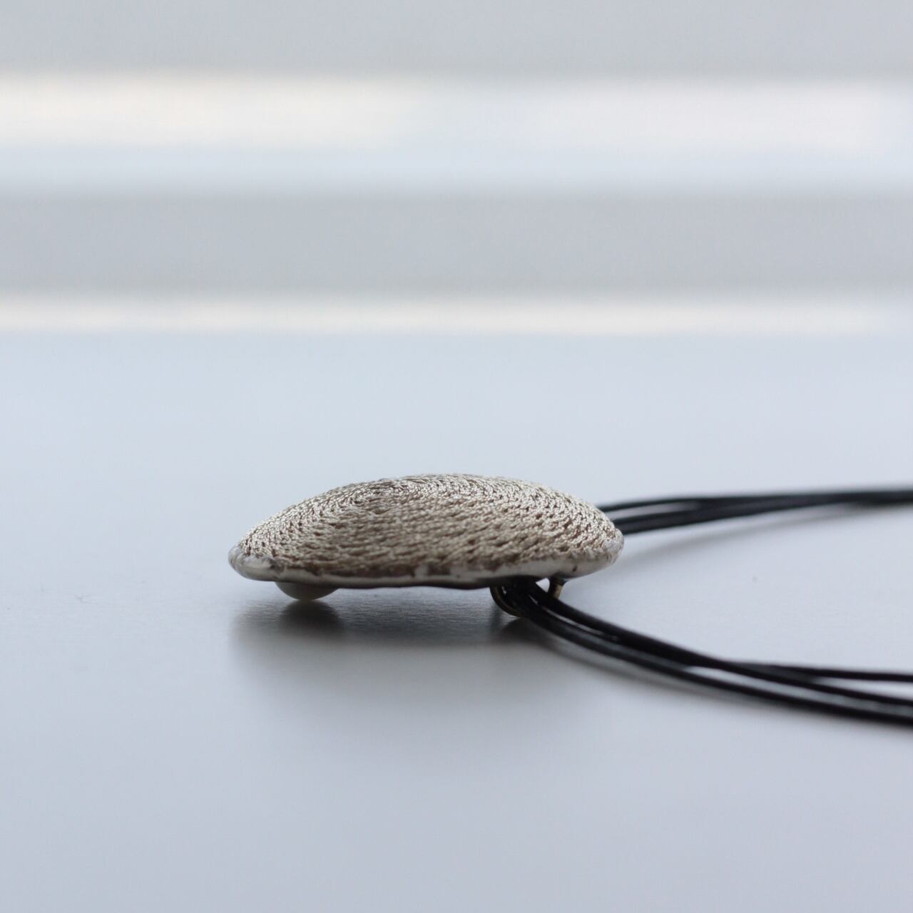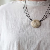 ペンダントの革紐は、長さを変えて束ねる事で、たわんだシルエットに。